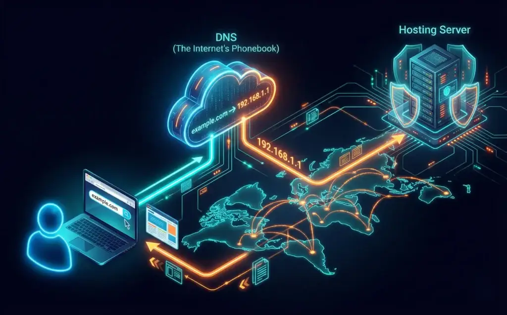 When someone enters your domain in a browser, the internet locates your server (hosting), which retrieves the website files, and shows the web page.